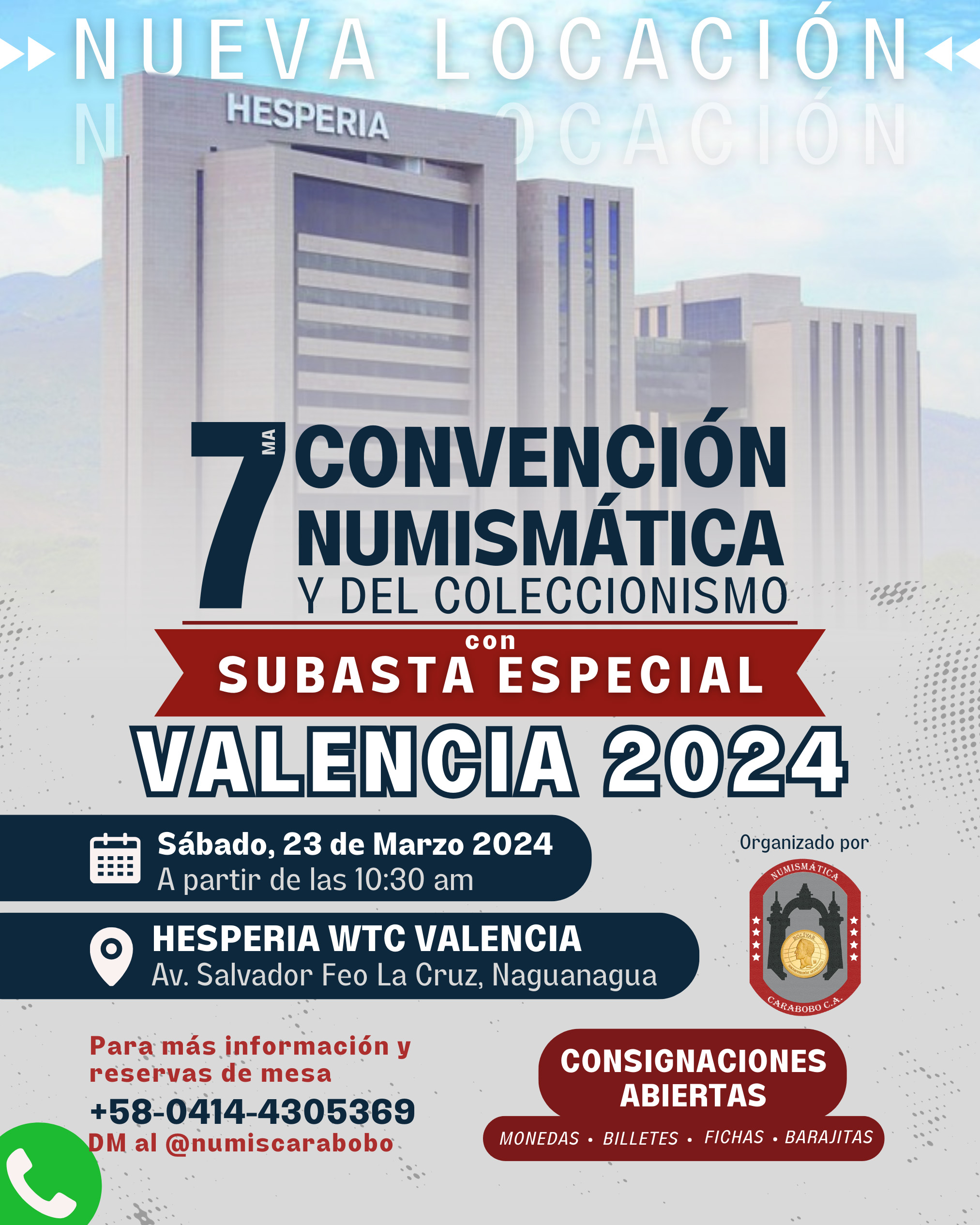 Numismática Carabobo, C.A. is pleased to invite to the 7th Numismatic Convention and Collecting VALENCIA 2024, to be held on