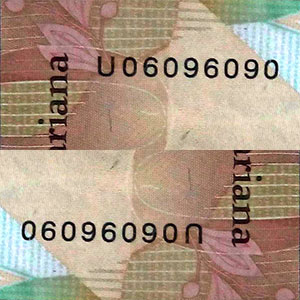 A banknote with serial number that can be read the same rotating upside down. The digits of the serial number that allow this are "0", "6", "8" and "9".